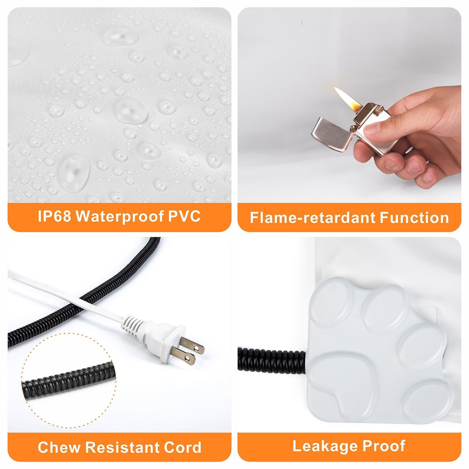 [Structure of Security Certification]7 Layer Protective Structure pet heating pad is made of sherpa fleece cover, waterproof PVC enclose, refractory wool and heating wire. Flame Retardant & Waterproof PVC heating pad has the highest-grade V-0 flame retardant capability with UL approved heating wire will prevent your pet from get burnt.